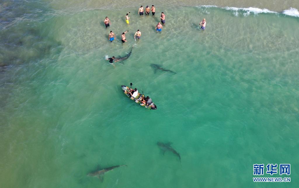 4月20日,在以色列北部城市哈代拉的海边,鲨鱼从人们身边游过(无人机照片)。