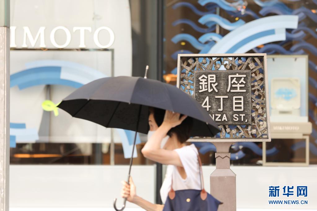 2020年8月15日,高温下行人打伞走在日本东京银座街头。