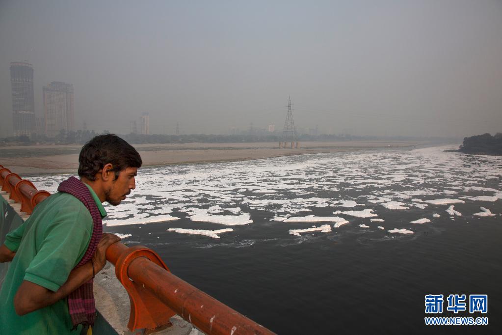 2019年11月12日,一名男子在印度首都新德里眺望亚穆纳河,河面上漂浮着大量白色污水泡沫。