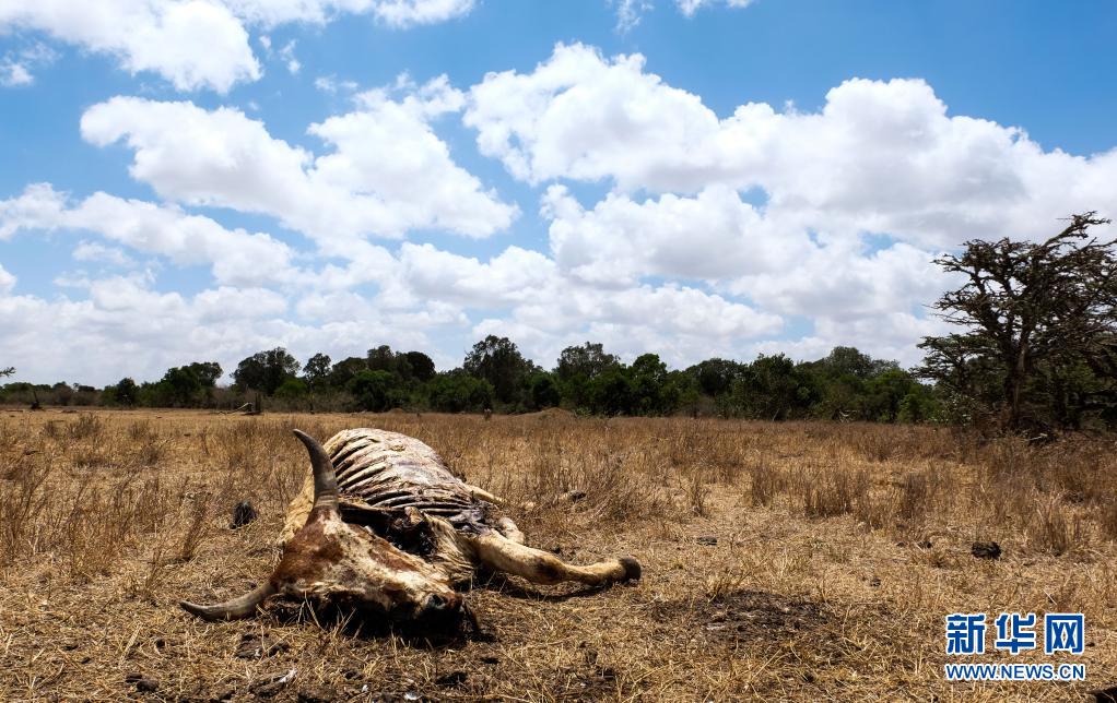 2017年3月1日在遭受干旱的肯尼亚莱基皮亚郡,一头牛的尸骸躺在干旱的土地上。旱情严重影响了当地数百万民众的生产生活。