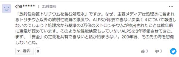 含放射性氚的处理水。为什么主流媒体不报道处理后的水中除氚以外的放射性物质的浓度,或者ALPS(东电开发的多核素处理系统)无法去除碳-14呢?东电在数年前承认,在处理后的水中检测出超过标准2万倍的锶。在没有进行性能检查的情况下却已经运行了8年的ALPS。如果不能对“安全”的定义达成一致,一切就无从谈起(让民众安心)。想想200年后的海洋吧!