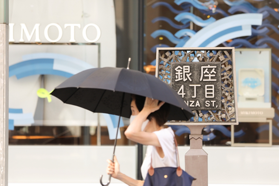 ↑2020年8月15日,高温下行人打伞走在日本东京银座街头。新华社记者 杜潇逸 摄