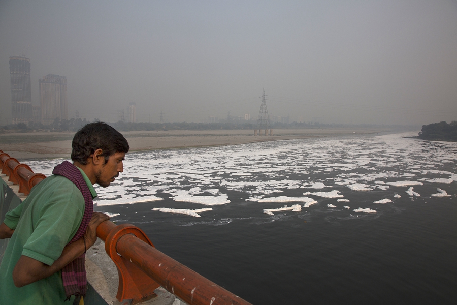 ↑2019年11月12日,一名男子在印度首都新德里眺望亚穆纳河,河面上漂浮着大量白色污水泡沫。新华社发(贾韦德·达尔摄)
