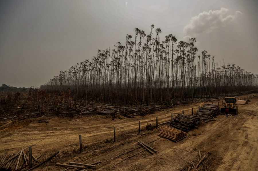 ↑这是2019年8月25日在巴西亚马孙地区乌迈塔拍摄的被火灾破坏的桉树林。新华社发(加夫列拉摄)