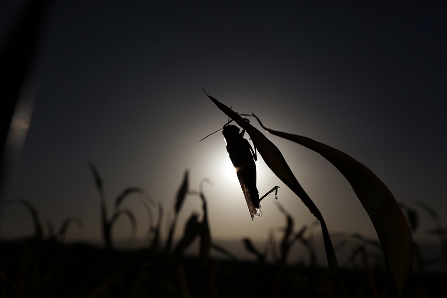 ↑近年来,东非、中东、南亚多地遭受大规模蝗灾。这是2020年10月24日,蝗虫在也门阿姆兰省的田间啃食庄稼。新华社发(穆罕默德摄)