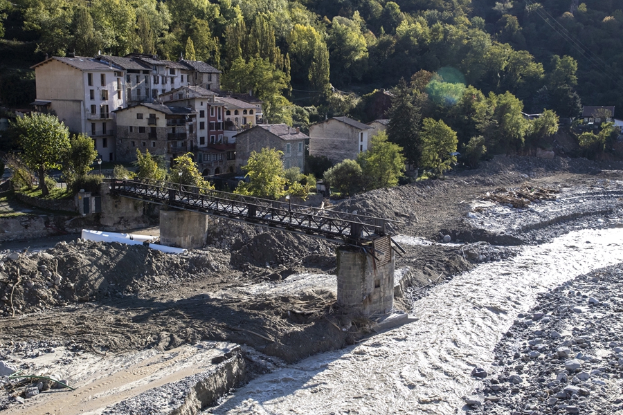 ↑这是2020年10月12日拍摄的法国南部圣马丹韦叙比遭受暴雨洪水破坏的景象。法国和意大利交界地区遭遇暴雨及洪水袭击,造成多处房屋、桥梁和公路被毁。新华社发(法布里斯·桑佩尔摄)