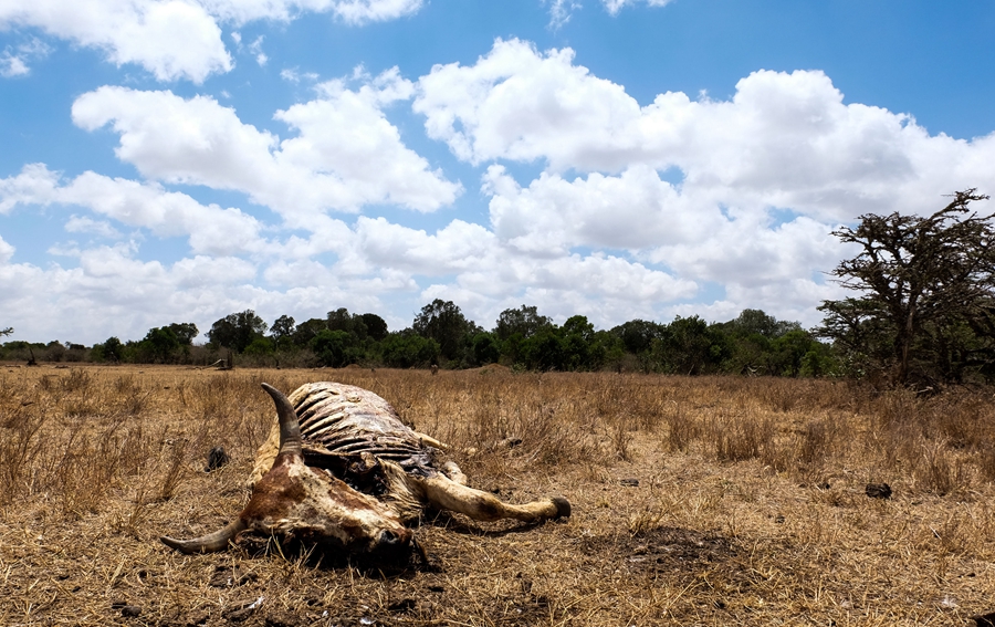 ↑2017年3月1日在遭受干旱的肯尼亚莱基皮亚郡,一头牛的尸骸躺在干旱的土地上。旱情严重影响了当地数百万民众的生产生活。新华社记者 潘思危 摄