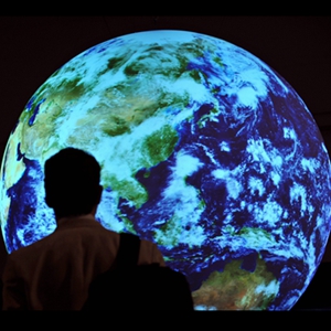 ↑这是2009年12月17日,在丹麦首都哥本哈根举行的联合国气候变化大会会场,一名与会人员站在地球模型前。新华社记者 武巍 摄