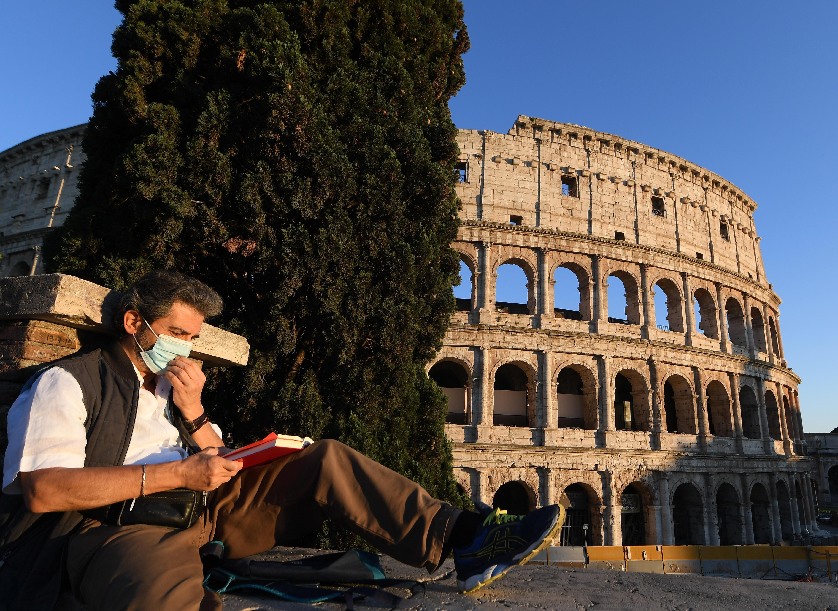 ↑一名戴着口罩的男子在意大利首都罗马的斗兽场附近看书。