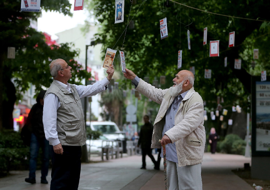 ↑人们在土耳其西北部的科贾埃利翻看挂在树上的图书。