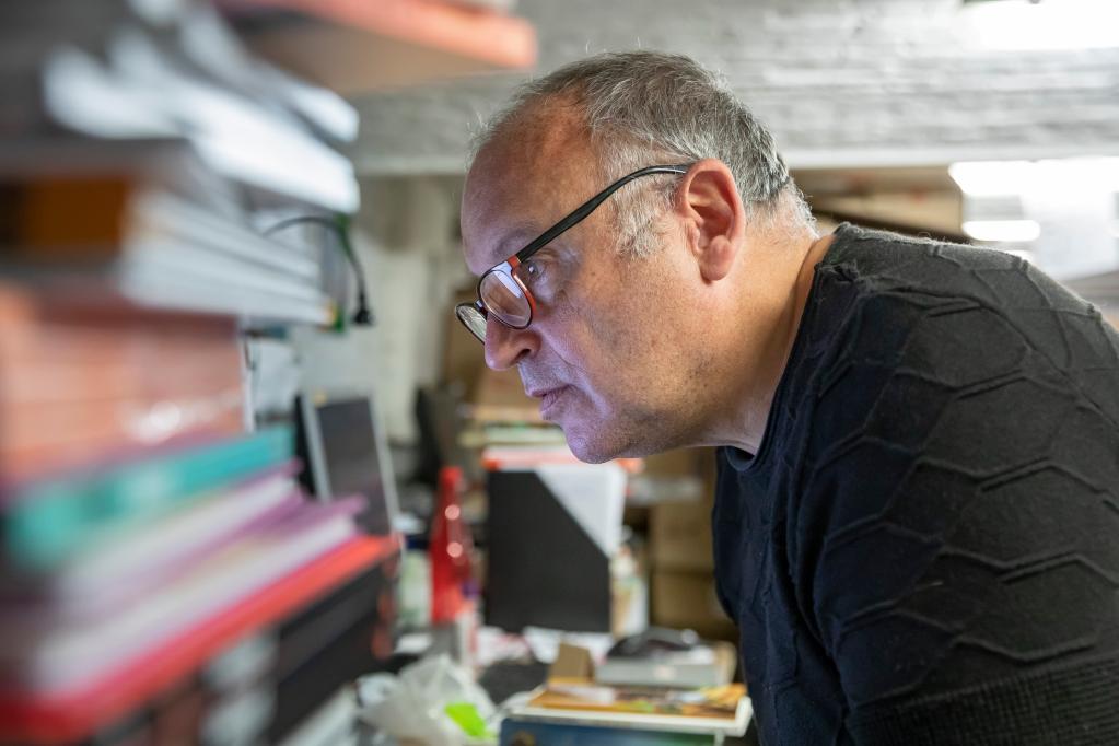 4月19日,在法国里尔,冈萨格·斯蒂吉斯特在书店仓库内整理书籍。新华社发(塞巴斯蒂安·库尔吉摄)