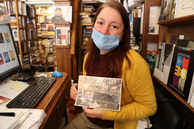 4月22日,“尼森”书店老板安娜·哈吉迪舍娃手中拿着母亲的照片。新华社记者林浩摄