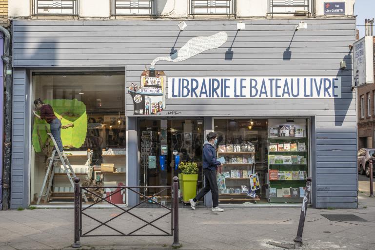 这家名为“书舟”的小书店,坐落在法国北部城市里尔一条安静的小街上。店面不大,工业风的简约外观,青灰色墙面上用孩童般的笔触画着一条大船,烟囱中冒出长篇累牍的文字。亲切又滑稽的“船长”就是店主——冈萨格·斯蒂吉斯特。