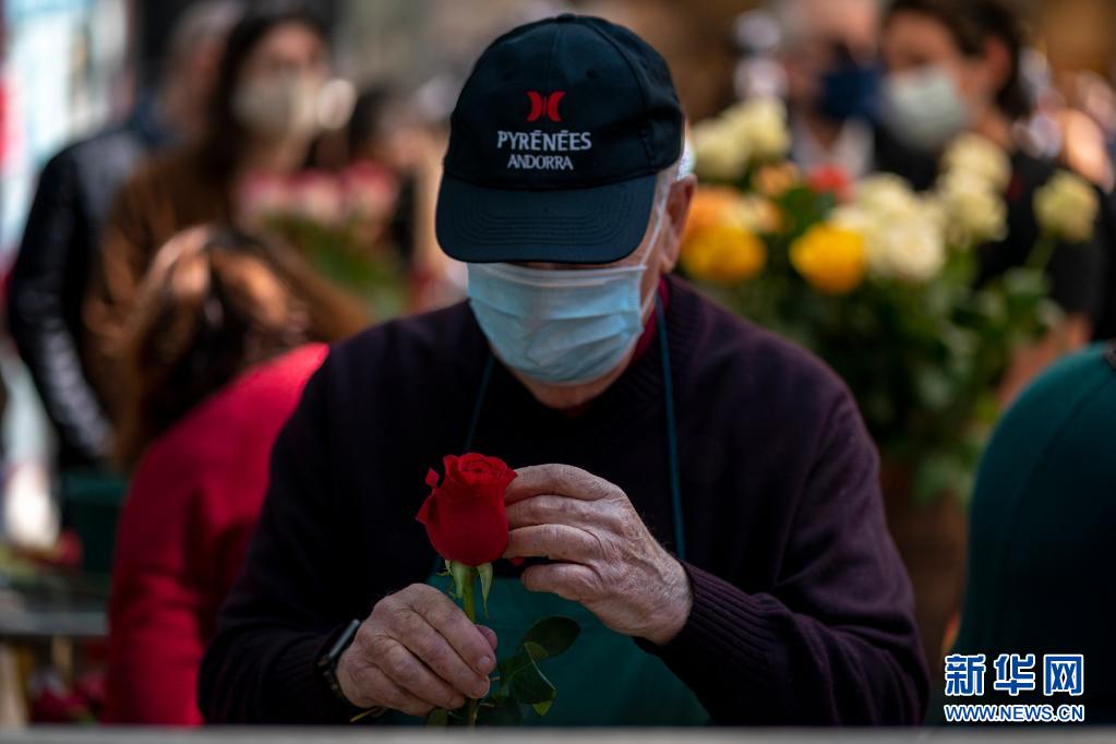 4月23日,一名老人手持玫瑰花走在西班牙巴塞罗那街头。