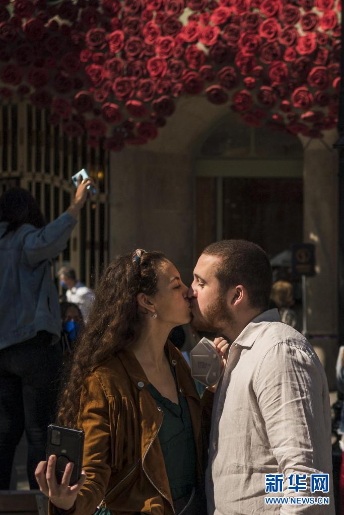 4月23日,一对情侣在西班牙巴塞罗那的街头亲吻。
