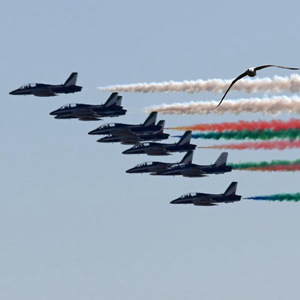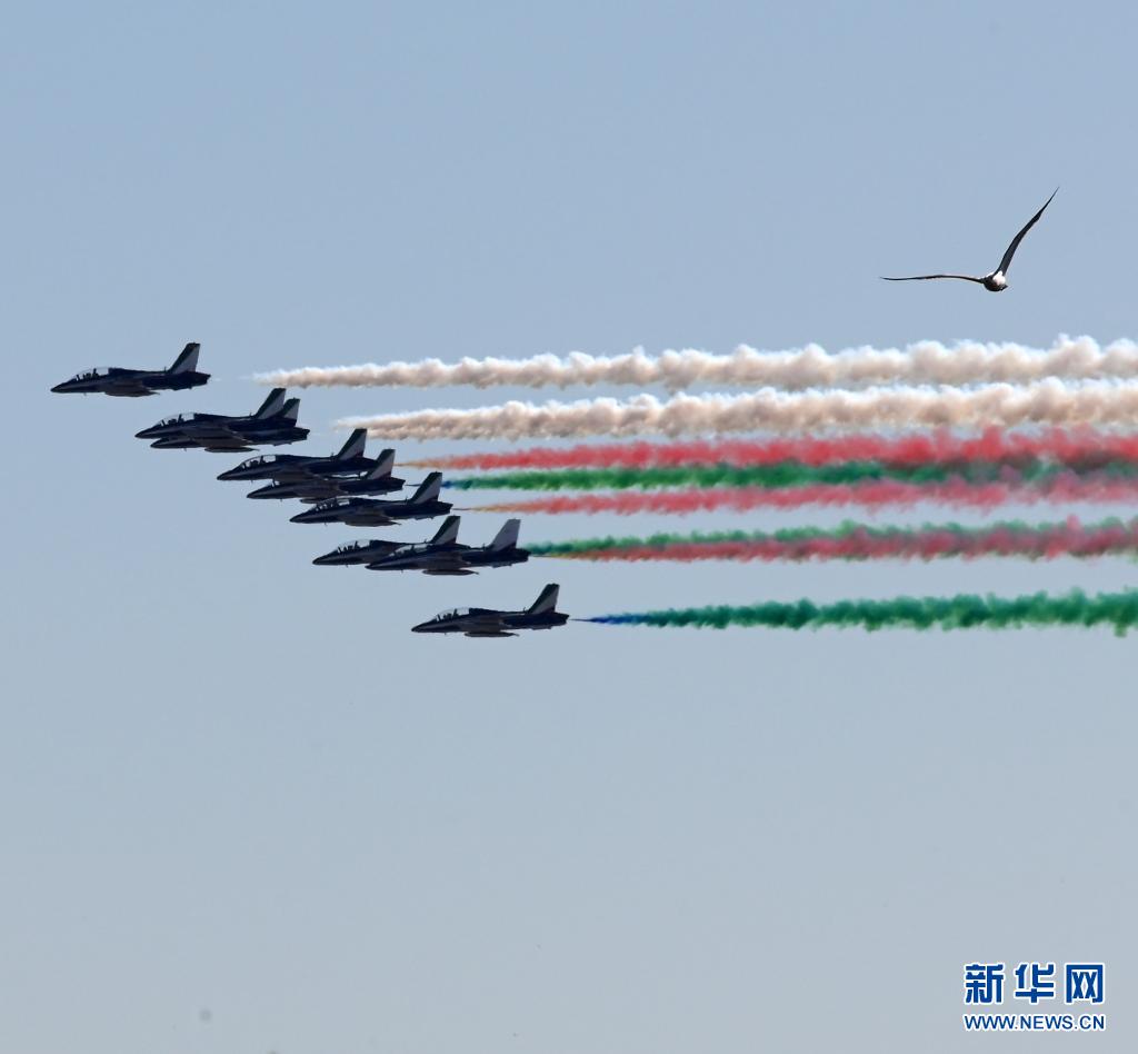 4月25日,意大利“三色箭”飞行表演队在罗马举行的纪念仪式上喷出代表意大利国旗颜色的红白绿三色烟雾。
