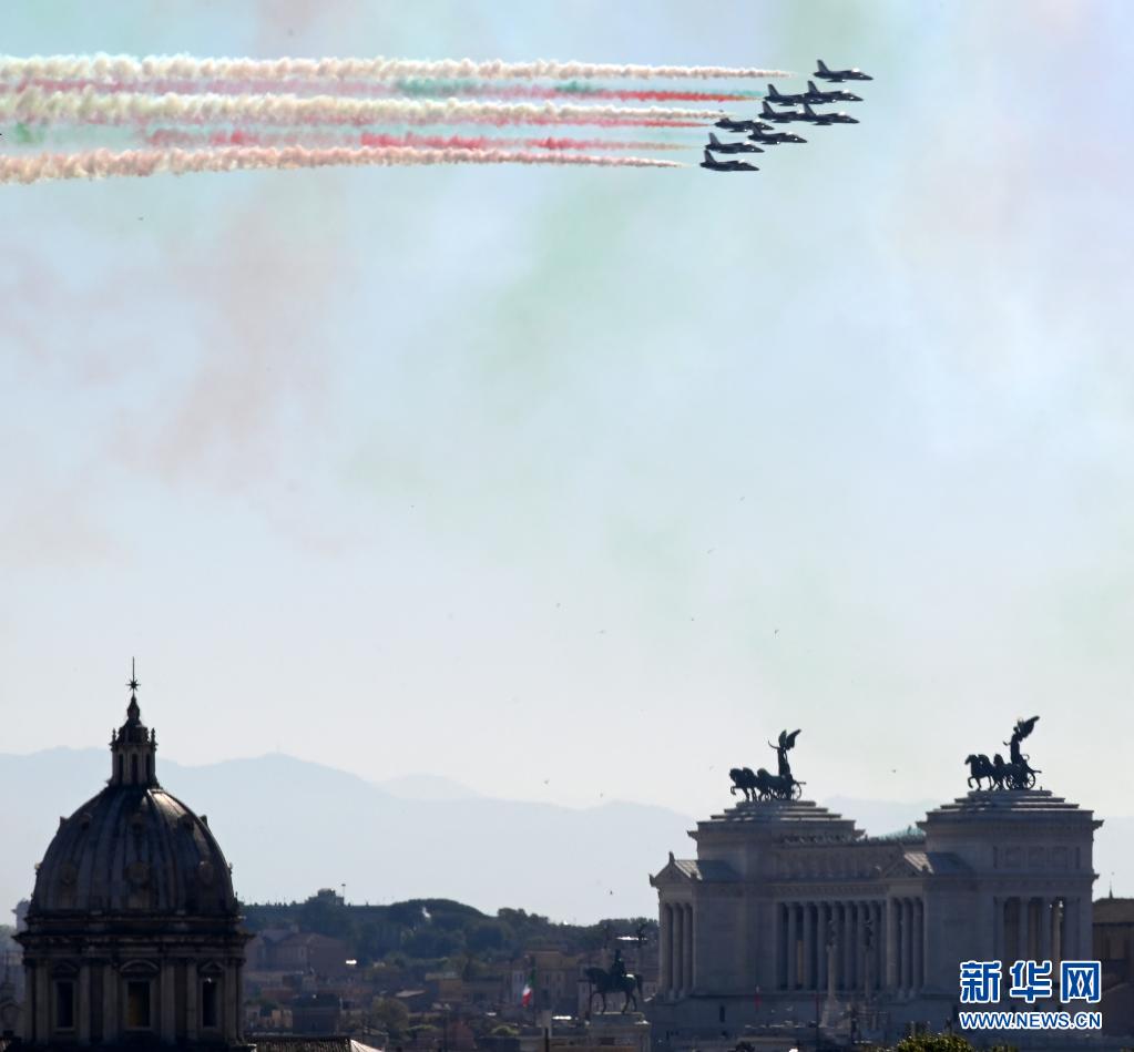 4月25日,意大利“三色箭”飞行表演队在罗马举行的纪念仪式上喷出代表意大利国旗颜色的红白绿三色烟雾。