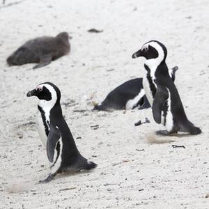 4月25日,一群非洲企鹅在南非西蒙镇企鹅滩上行走。