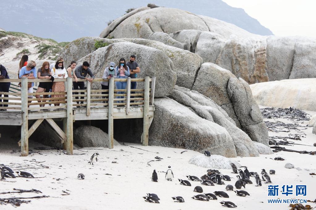 4月25日,游客在南非西蒙镇企鹅滩观赏非洲企鹅。