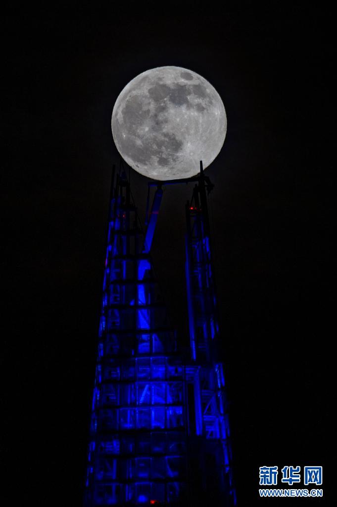 这是4月26日在英国伦敦拍摄的“碎片大厦”旁的“超级月亮”。