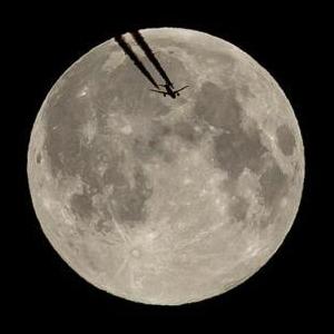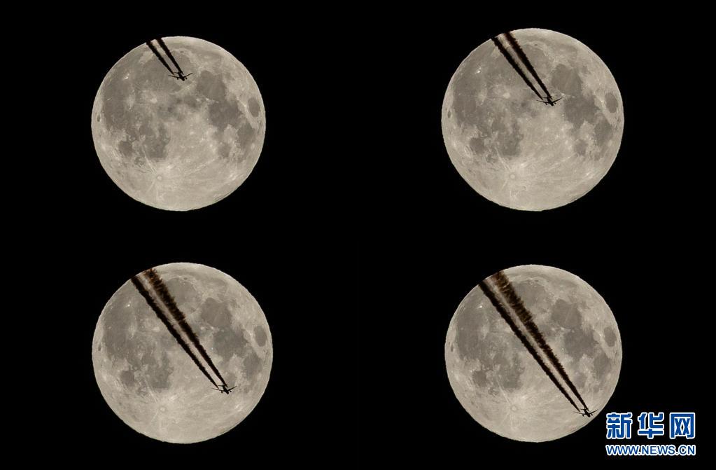 4月27日,一架飞机“飞过”法国巴黎上空的“超级月亮”(拼版照片)。新华社发(奥雷利安·莫里萨尔摄)