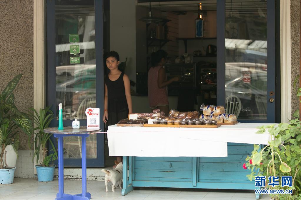4月27日,老挝琅勃拉邦古城一间面包店的店员等待顾客。