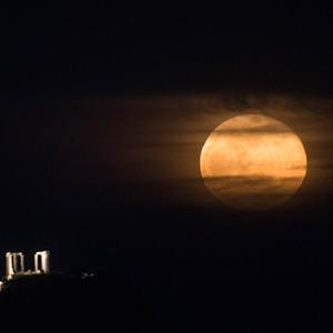 4月27日,“超级月亮”出现在希腊苏尼翁的海神庙遗址上空。新华社发(马里奥斯·罗洛斯 摄)