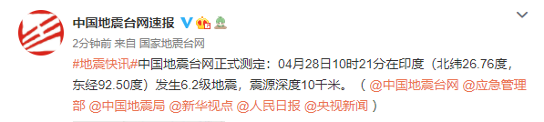 中国地震台网正式测定:04月28日10时21分在印度(北纬26.76度,东经92.50度)发生6.2级地震,震源深度10千米。