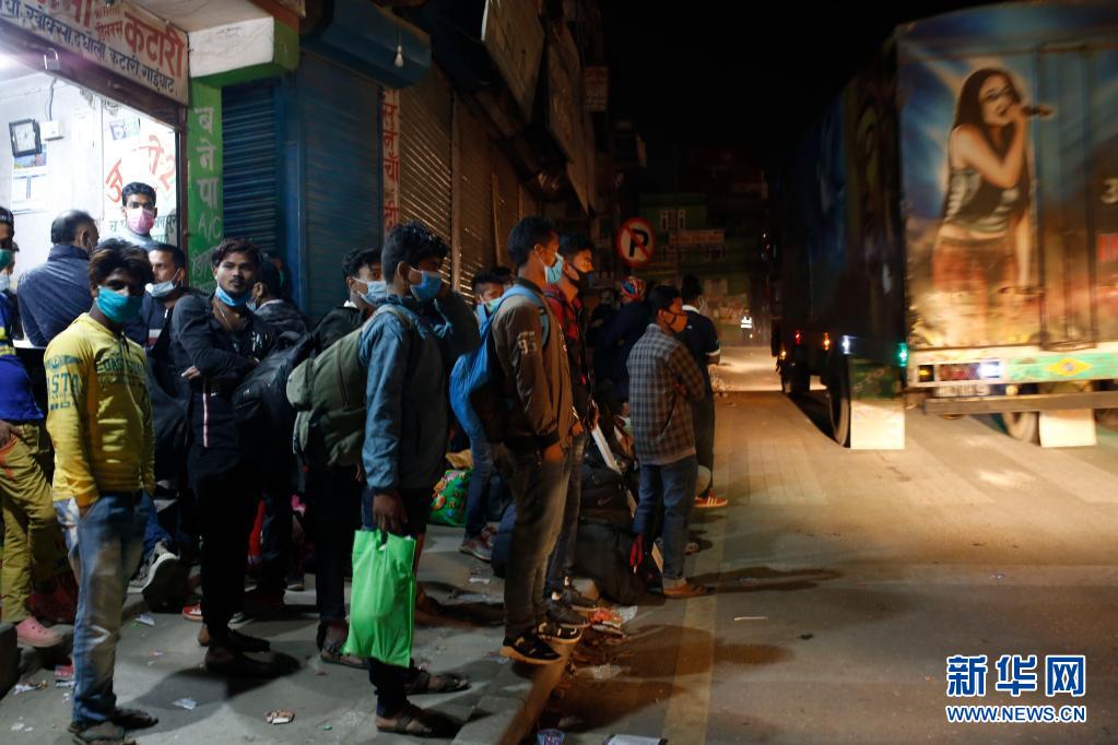 4月28日晚,人们在尼泊尔首都加德满都的路边等车,准备在封禁措施实施前离开加德满都返回家乡。