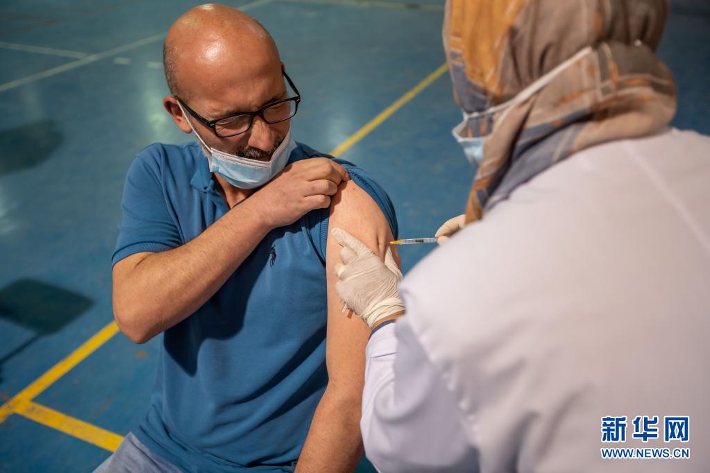 4月29日,在约旦河西岸城市伯利恒,一名男子接种第二剂中国国药集团新冠疫苗。