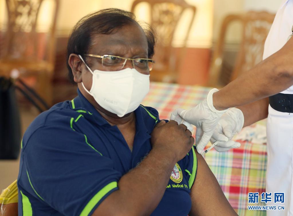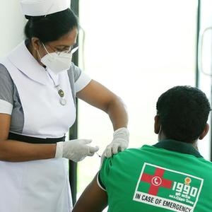 4月29日,一名医护人员在斯里兰卡科伦坡国家医院接受新冠疫苗注射。