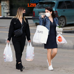 4月29日禁令实施前,两名戴口罩的女子在土耳其安卡拉上街购物。