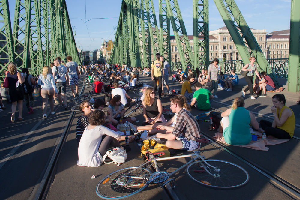↑匈牙利首都布达佩斯的自由桥上,人们参加野餐快闪活动