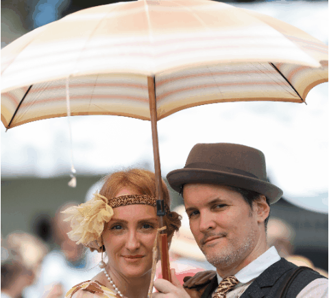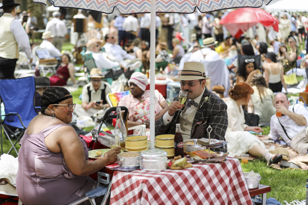 ↑美国纽约参加“爵士时代草坪派对”的人们在野餐