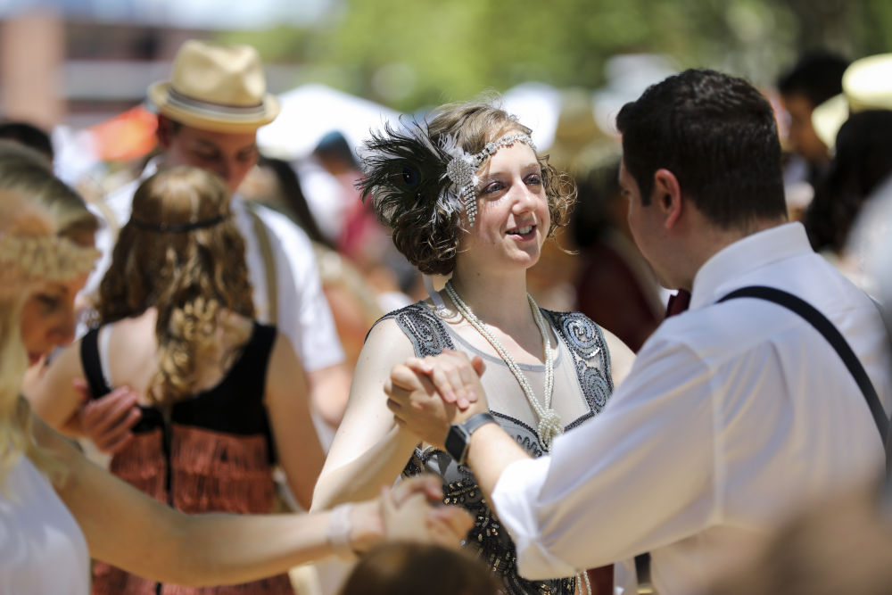↑美国纽约参加“爵士时代草坪派对”的人们在跳舞