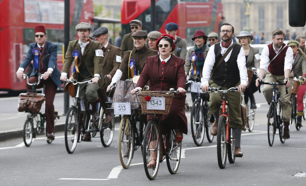 ↑在英国伦敦,人们参加粗花呢复古骑行活动
