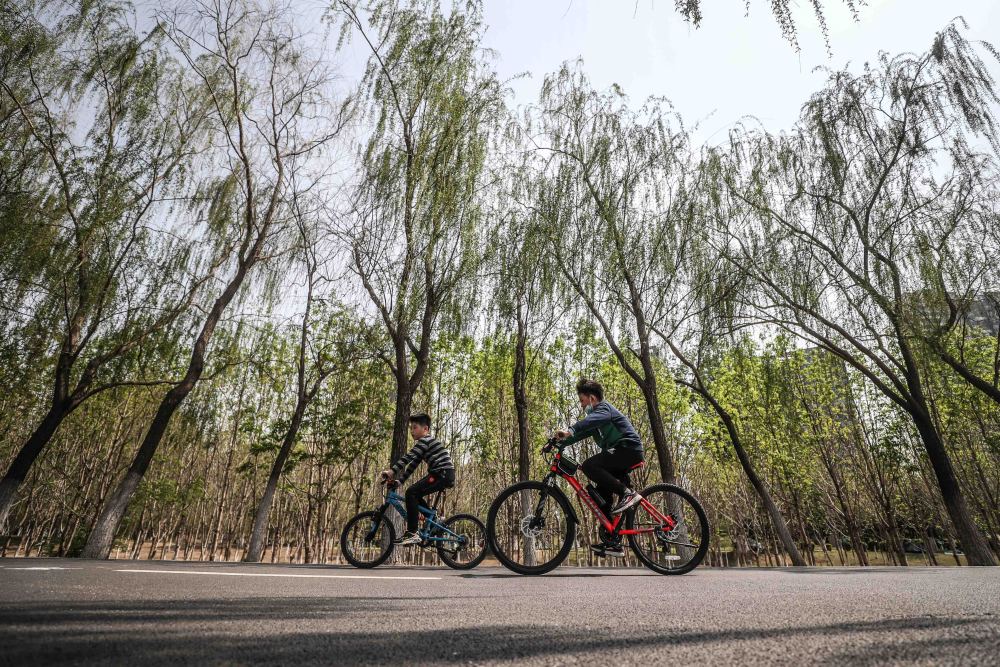 ↑踏青的小朋友在沈阳浑河沿岸的滩地公园骑行