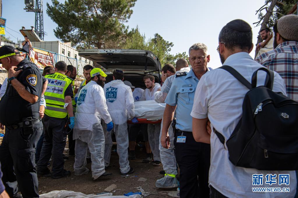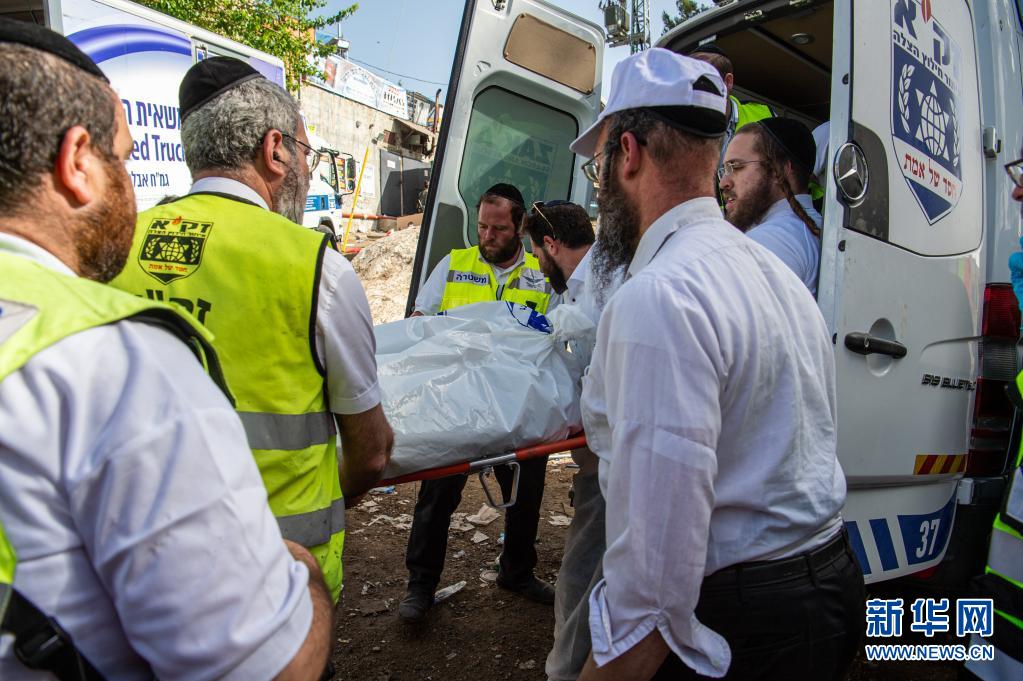 4月30日,救援人员在以色列北部梅龙山踩踏事故现场附近将遇难者遗体抬上救护车。新华社/基尼图片社