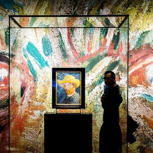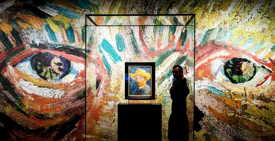 图为荷兰阿姆斯特丹梵高博物馆,一名男子经过梵高的《戴草帽的自画像》。新华社发