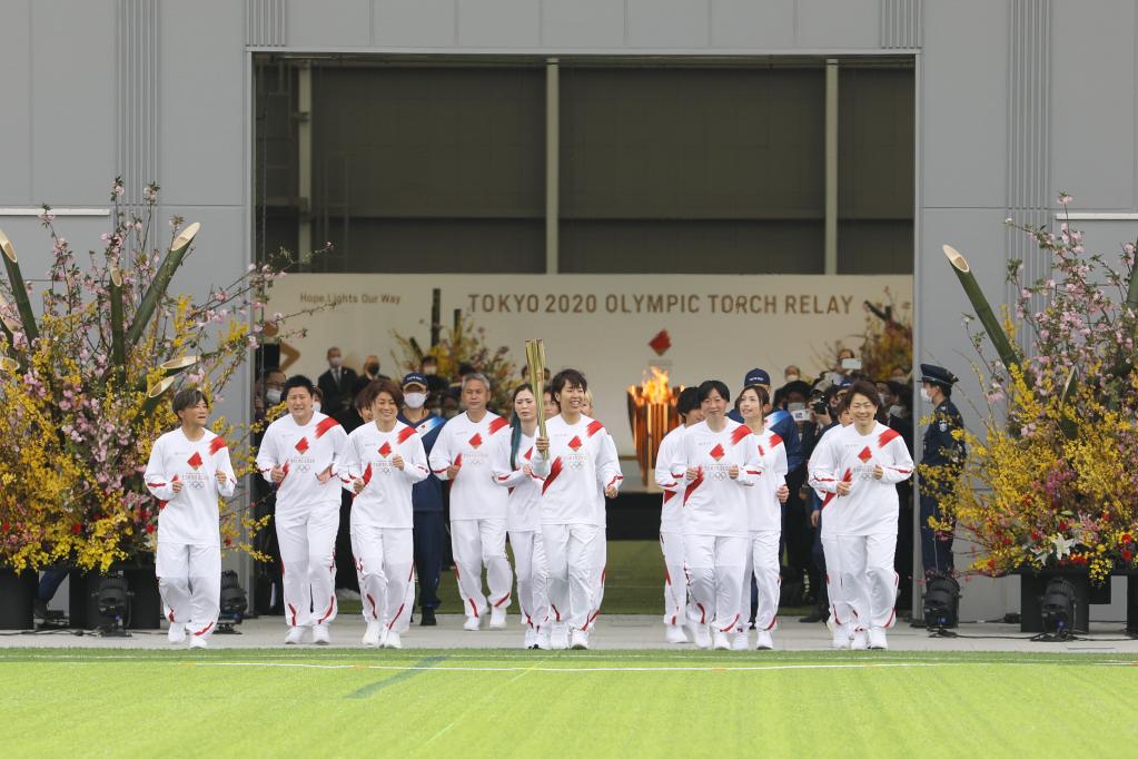 3月25日,东京奥运会火炬传递在日本福岛国家足球训练中心拉开帷幕,在2011年德国女足世界杯中夺冠的日本女子国家队部分成员成为第一棒火炬手。(新华社记者杜潇逸摄)