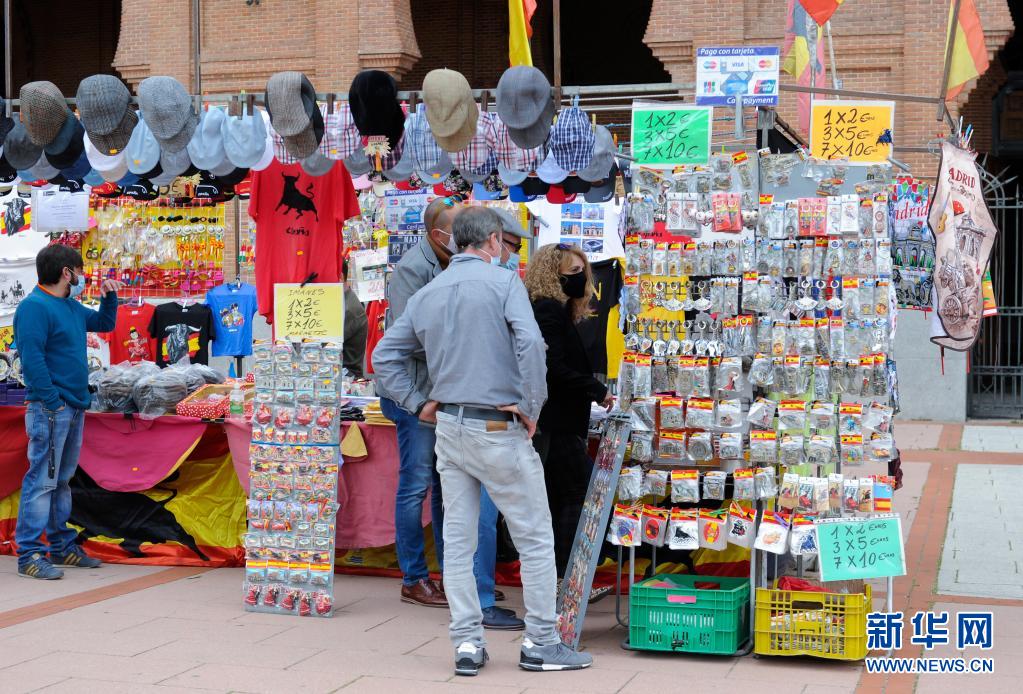 5月2日,人们在西班牙马德里拉斯本塔斯斗牛场外挑选纪念品。