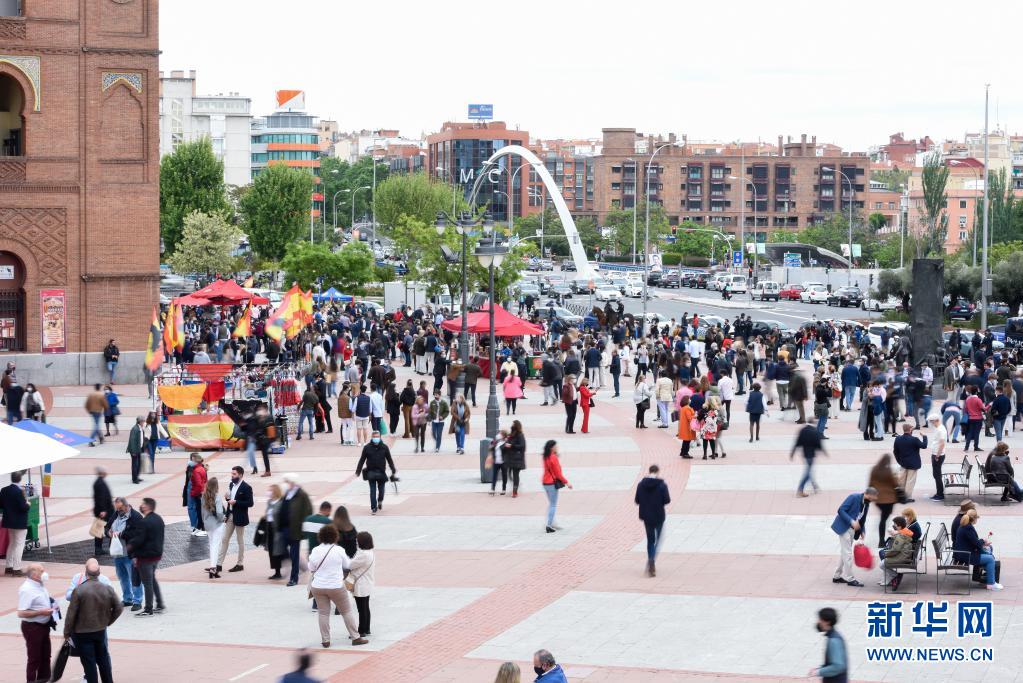 5月2日,人们聚集在西班牙马德里拉斯本塔斯斗牛场外。