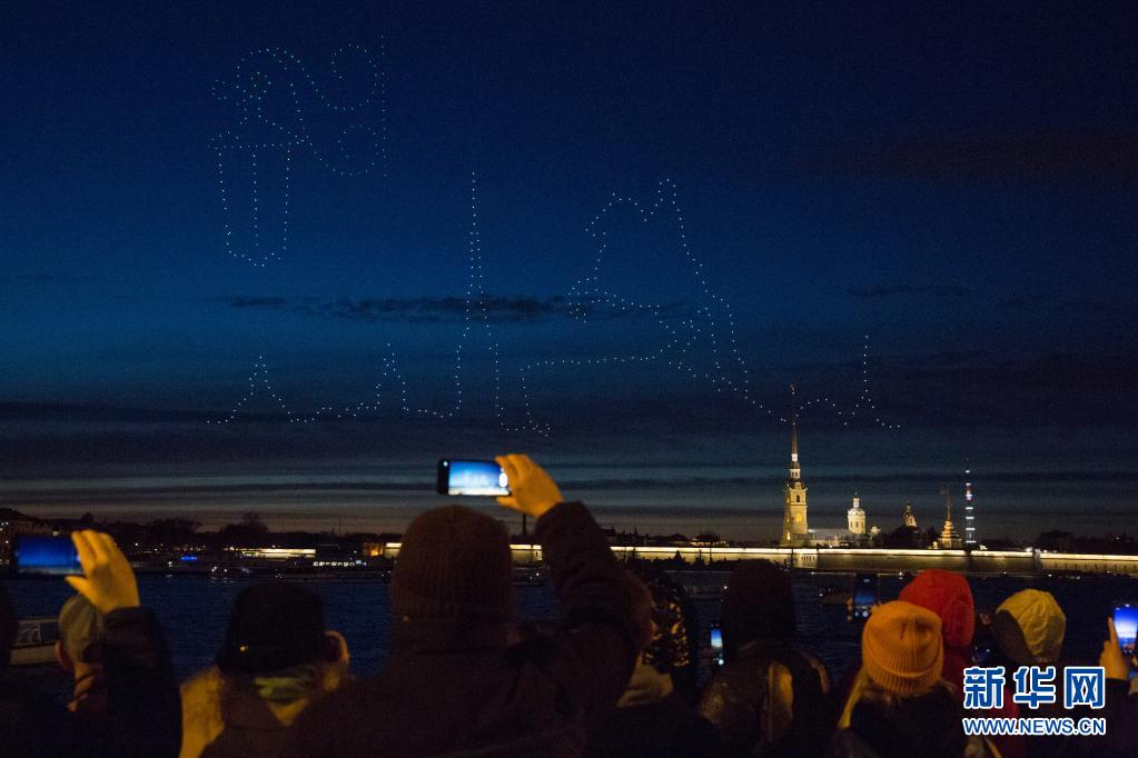 当晚,圣彼得堡举办无人机节,无人机编队在圣彼得堡的夜空展现出各种图案。
