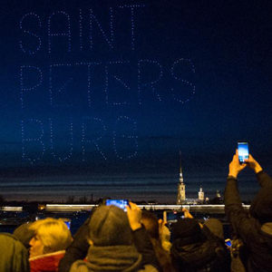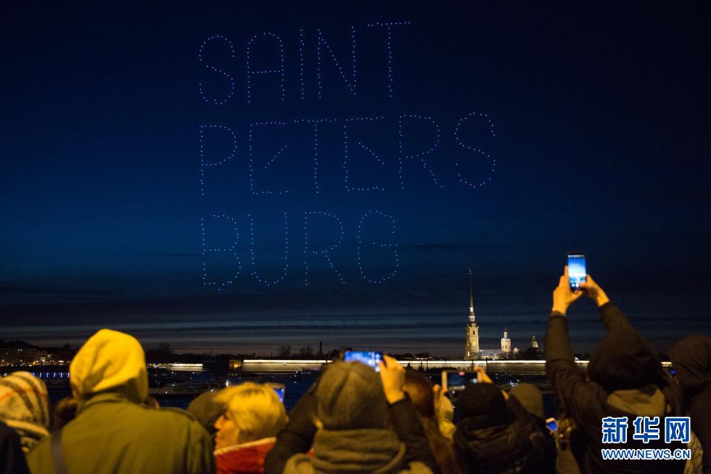 5月2日,无人机编队在俄罗斯圣彼得堡彼得保罗要塞上空摆出圣彼得堡英文字样。