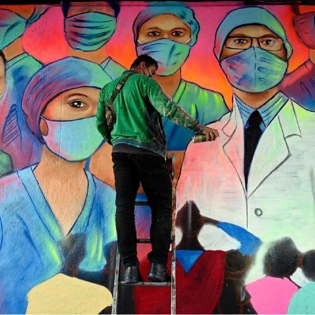 一些当地艺术家通过涂鸦、壁画等艺术创作,缅怀逝者,赞美一线抗疫人员,鼓励民众再接再厉抗击疫情,把生命的色彩还给“后疫情生活”。
