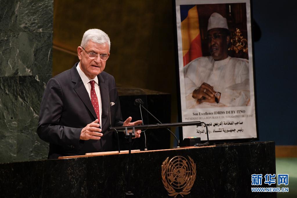 5月3日,在位于纽约的联合国总部,第75届联合国大会主席博兹克尔在悼念乍得总统代比的活动上讲话。
