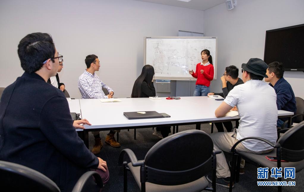 这是4月30日在澳大利亚伍伦贡大学拍摄的中国博士留学生李艳楠(中)和其他在读博士生交流。