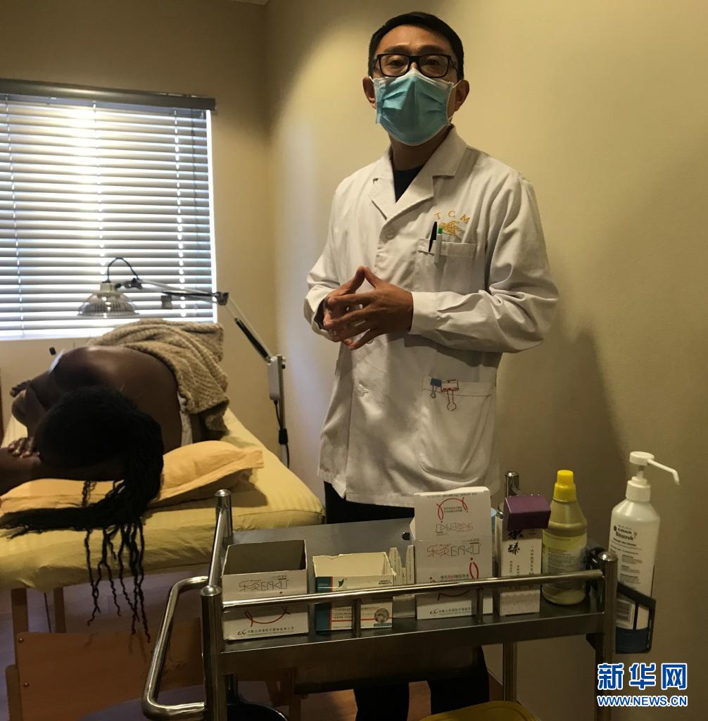 4月22日,王鹏在纳米比亚首都温得和克为当地病人进行中医治疗。新华社发(恩达林平嘉 摄)