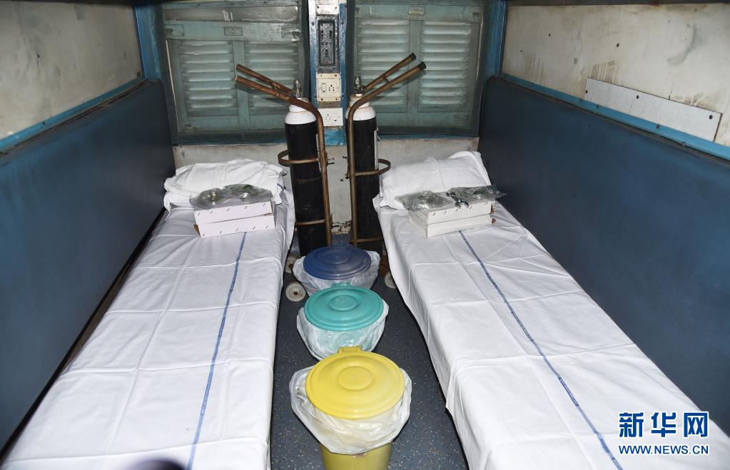 这是5月5日在印度高哈蒂火车站拍摄的改造成临时病房的列车厢。