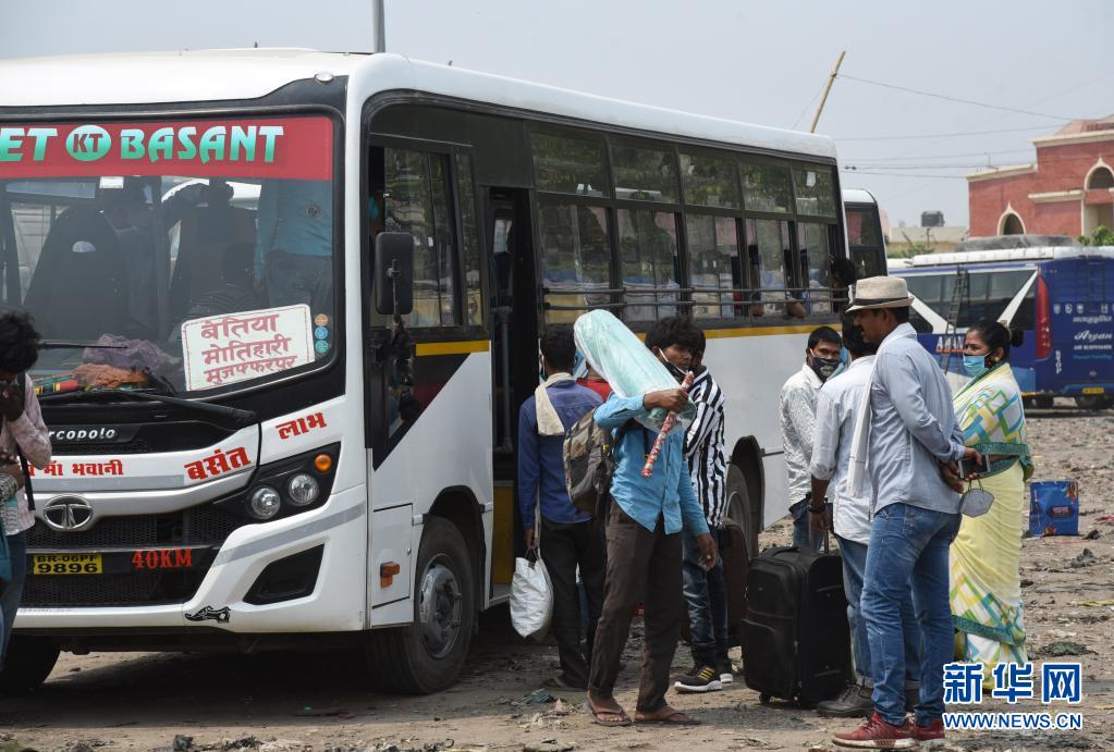5月5日,印度比哈尔邦宣布实施封锁措施后,人们在印度巴特那汽车站准备乘坐巴士返回家乡。新华社发